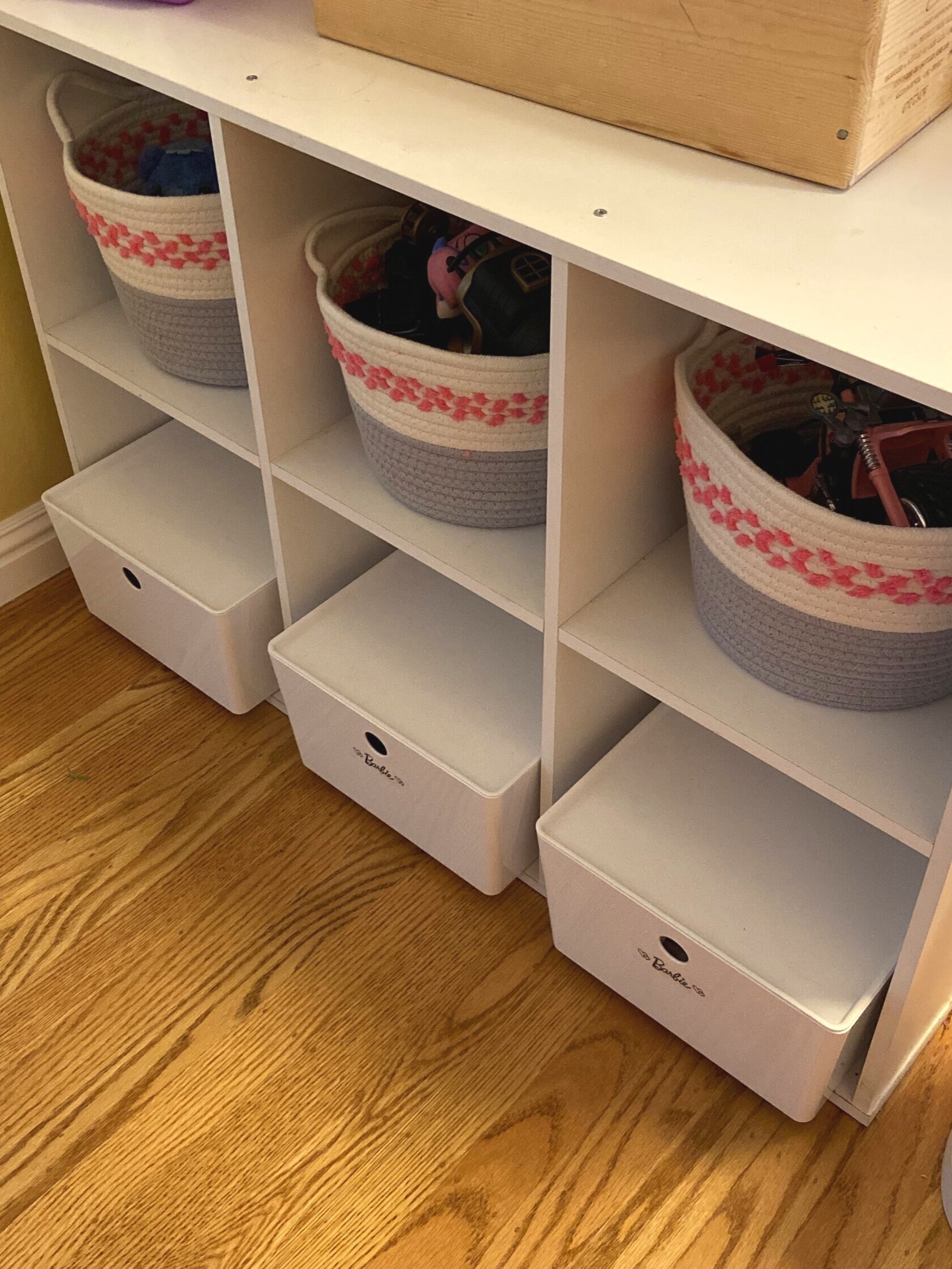 Now when I walk by my daughter’s room, I smile at these adorable little baskets. Easy for her to see toys and easy for her to PUT AWAY toys too.